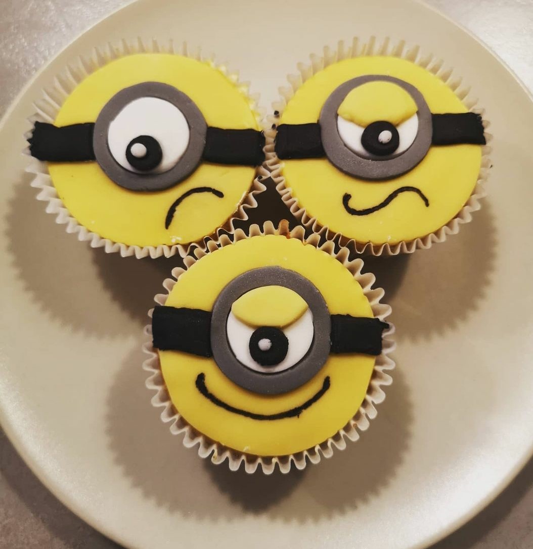 Box of 6 vanilla cupcakes topped with fondant minion faces.